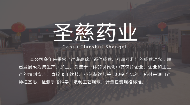 甘肅天水圣慈藥業(yè)有限公司成立于2016年11月8日,注冊(cè)資本500萬(wàn)元,位于甘肅省天水市張川回族自治縣張川鎮(zhèn)中城南路,本公司多年秉承“嚴(yán)謹(jǐn)高效、誠(chéng)信經(jīng)營(yíng)、互贏(yíng)互利”的經(jīng)營(yíng)理念,現(xiàn)已發(fā)展成為集生產(chǎn)、加工、銷(xiāo)售于一體的現(xiàn)代化中藥飲片企業(yè)。企業(yè)加工生產(chǎn)的精制飲片、直接服用飲片、小包裝飲片等100多個(gè)品種,藥材來(lái)源自產(chǎn)種植基地、檢測(cè)手段科學(xué)、炮制工藝規(guī)范、計(jì)量包裝規(guī)格標(biāo)準(zhǔn)。